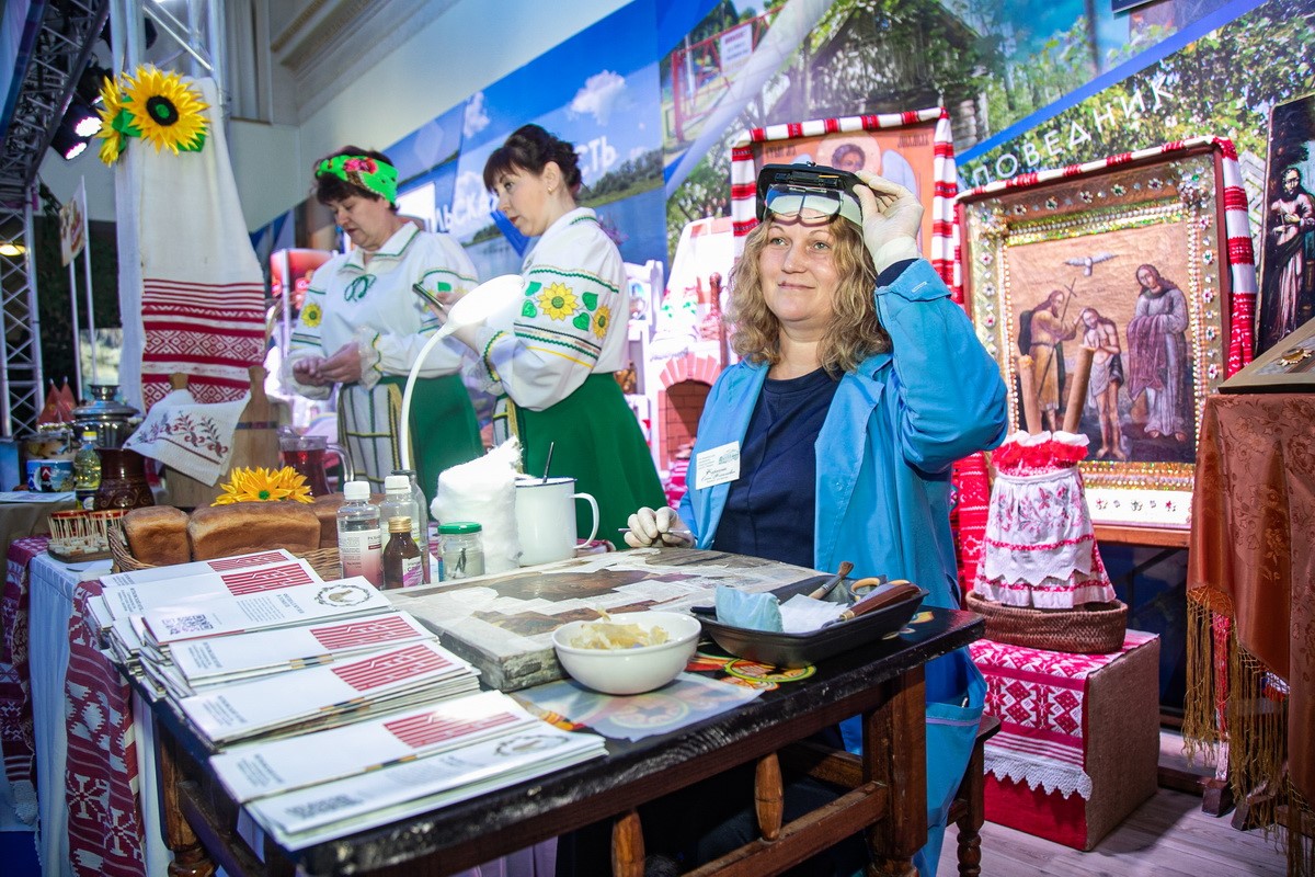 Прямо напротив Витебского павильона расположились стенды Гомельской области. За одним из них художник-реставратор Ветковского музея старообрядчества Елена Карпенок показывает посетителям, на что похож процесс реставрации древней иконы: