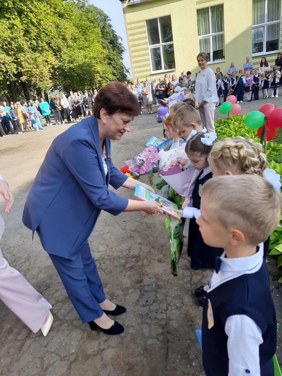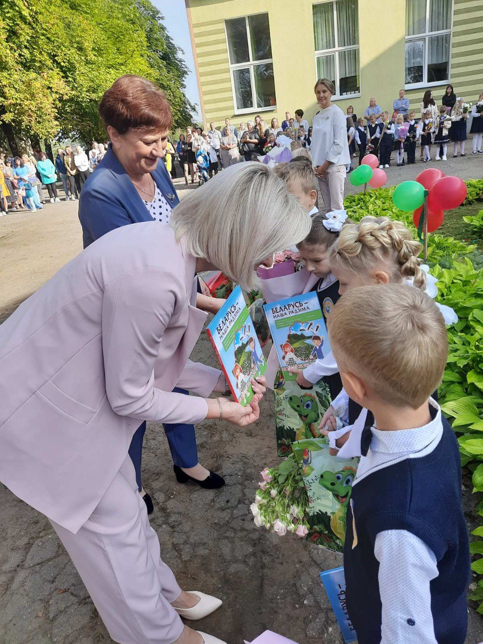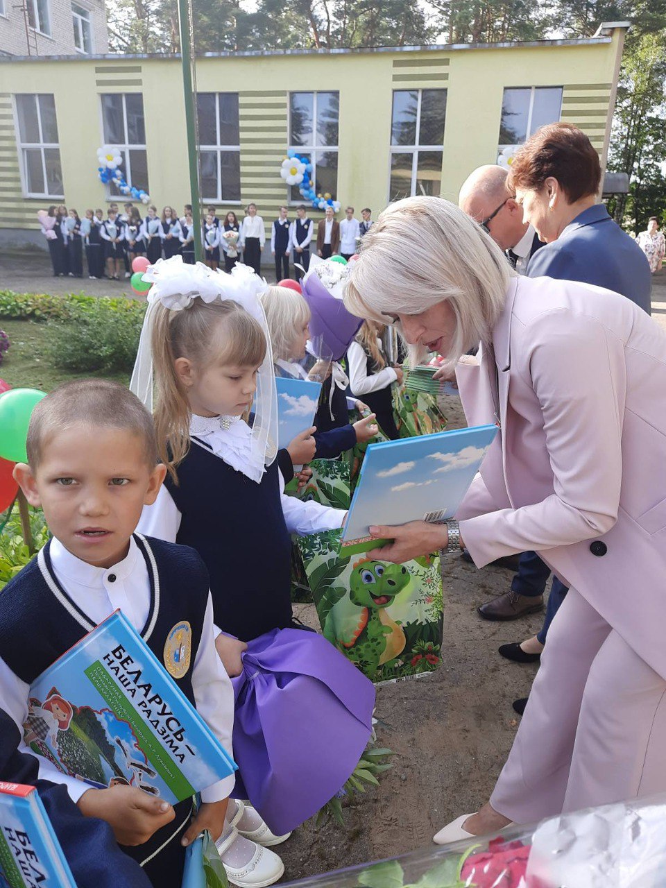 Много слов поздравления звучали в адрес педагогов, учащихся и их родителей. А тем, кто впервые переступил школьный порог были вручены подарки от Президента Республики Беларусь. Дети получили красочную книгу под названием "Беларусь - наша Радзіма".