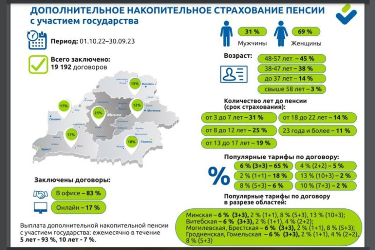 По вовлеченности в проект накопления на «вторую пенсию» с участием государства и нанимателей лидирует пристоличный регион. На Минскую область приходится 23% заключенных договоров. Почти одинаковые позиции занимают Гомельская (18%), Брестская и Гродненская области (по 17%). На Витебщине и Могилевщине договоры накопительного пенсионного страхования заключили соответственно 13% и 12% от общего числа участников программы.