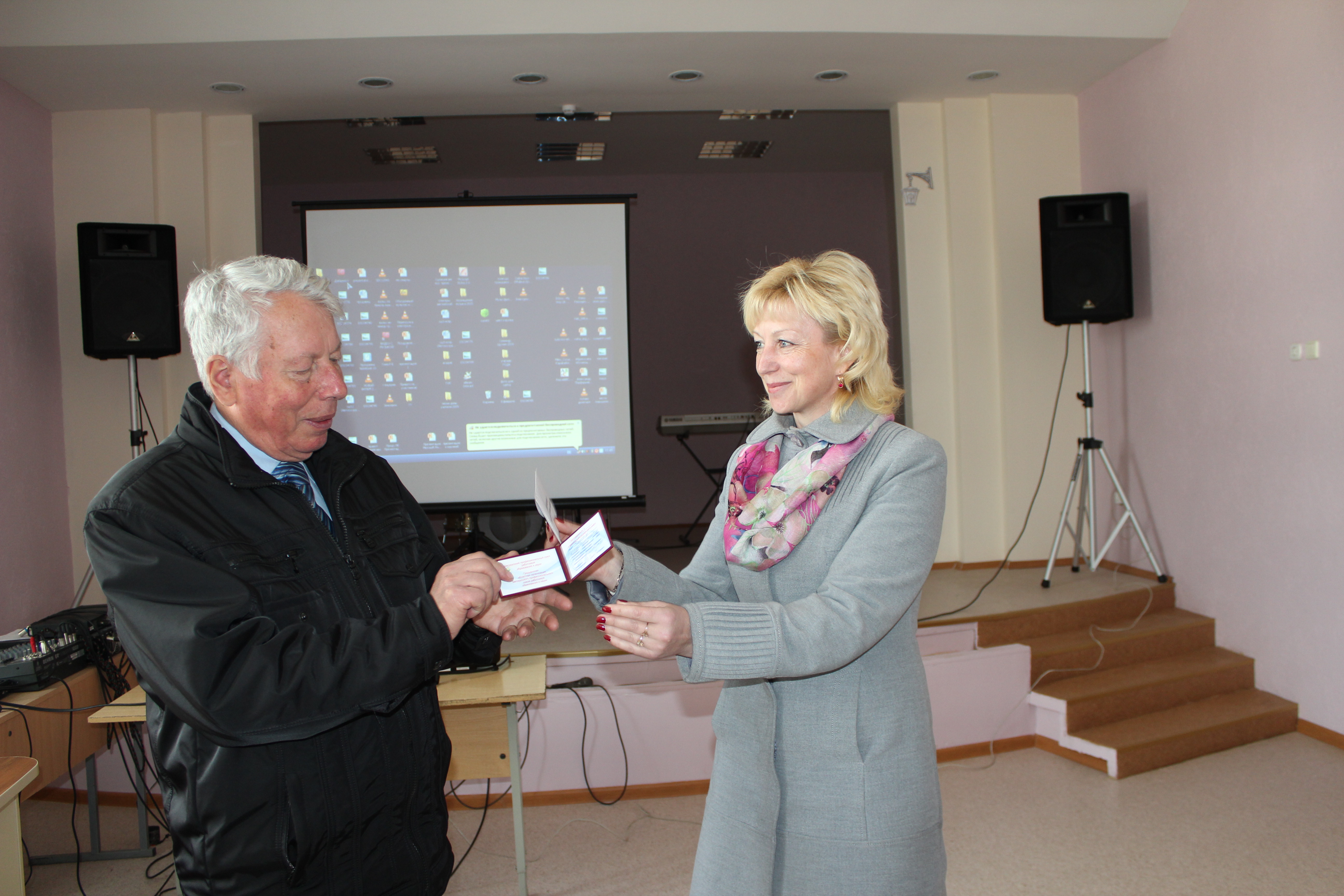 Удостоверение о занесении в виртуальную Книгу почета Гродненского обкома отраслевого профсоюза вручила ветерану педагогического труда, лидеру Совета ветеранов Щучинщины Э.С.Дикевичу председатель РК профсоюза Г.В.Вощило.