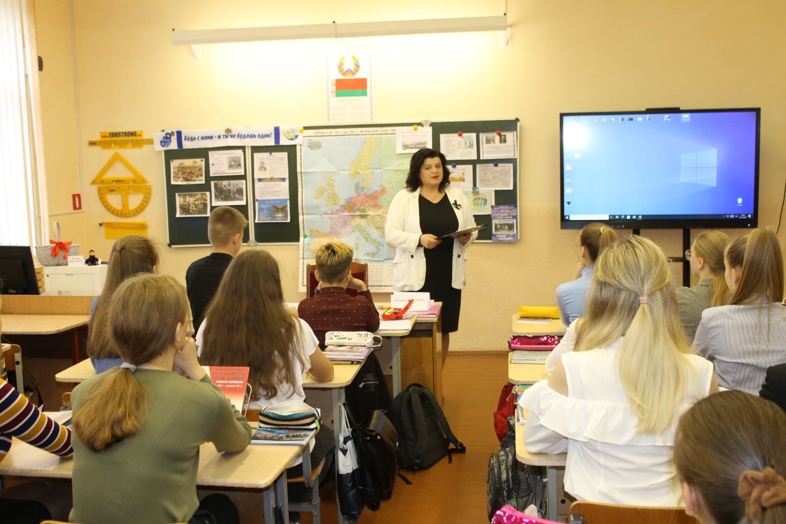 В своё время Татьяна Николаевна окончила Гродненский университет имени Янки Купалы и 15 лет преподавала историю в школе. Педагогический опыт и авторитет среди коллег помогают ей и в нынешней работе. Умело профсоюзный лидер педагогов района связала тему урока со 100-летней историей отраслевого профсоюза.